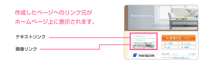ページ作成の際に自動リンク設定を行うことで、ホームページ上にページへのリンク元を設定することができます。テキストリンク、画像リンクのどちらにも対応しています。表示順序を設定することも可能です。